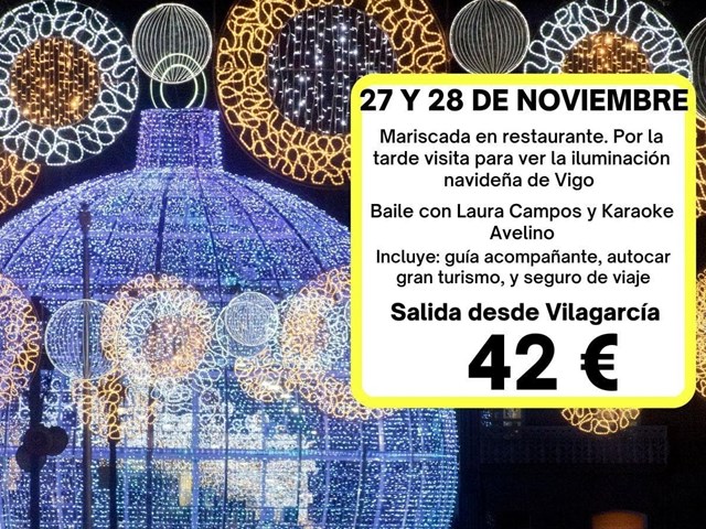Fin de temporada Salidas desde Vilagarcía 27/11/2021 28/11/2021 Vigo Baile con Laura Campos y Karaoke Avelino. Fiesta fin de temporada: Mariscada en restaurante. Por la tarde visita para ver la... Leer más